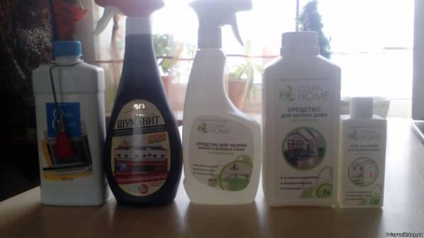 с лева штука с кисточкой из амвея для мытья плит и духовок, потом шуманит для того же, средство для мытья кабины душевой, потом для всего дома очень хоошее средство пылюка не так садится и для мытья холодильника.....