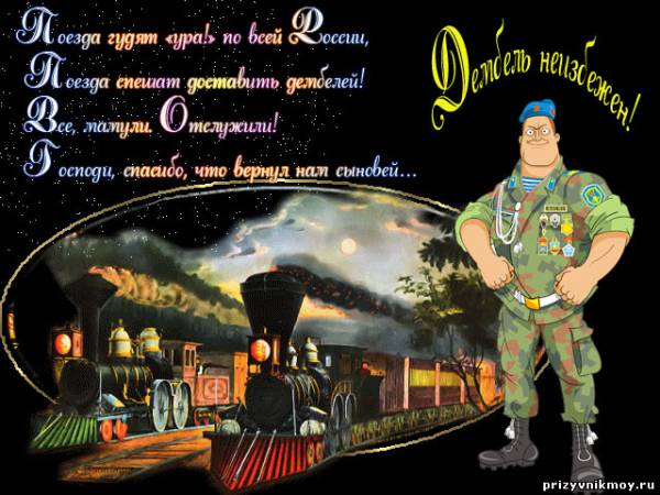 | Цитата (гера) сумашедшая мамаша(как называют меня девочки на работе), которая плачет по поводу и без. Цитата (гера) А раздражают меня те - у которых дети не служили , вот они то и говорят что сейчас не армия ,а дедсад, а так как я человек по жизни очень эмоцианальный ,а в свете последних событий(уход ребенка в армию) вообще плохо контролируемый, ОльгаК, Мы когда с девчонками сели в поезд из Новосибирска до Барнаула Вм купе сидели мужчина и женщина. они нас спрашивают : а вы откуда едите? мы и скажи, что от сыновей с Армии. В ответ мы услышали просто откровенный смех Цитата (ОльгаК) Древняя мудрость говорит:не спорь с глупцом, иначе люди могут не заметить разницу! Вот и я так решила в тот момент, а вслух сказала что нам не о чем разговаривать. Так подъезжая к Барнаулу мы даже телефонами обменялись. неудобно, наверно им стало. Цитата (ОльгаК) А что ж они в это "детсад" своих не пущают? Цитата (lida97) А сам смеялся сам же над собой.. О! солдат ещё и с юмором! Цитата (Уралочка) Поэтому, я часто в начале службы говорила своему сыну:"Ты считаешь, что тебе невыносимо тяжело - я верю, но. Да в тяжёлые моменты надо думать о тех, кому нужна твоя помощь Цитата (гера) у каждого человека должен быть выбор. Это, вообще, не про Армию. Придет с Армии и будет выбирать - это хочу, а это не хочу. А сейчас их учат подчиняться, терпению и стойкости.