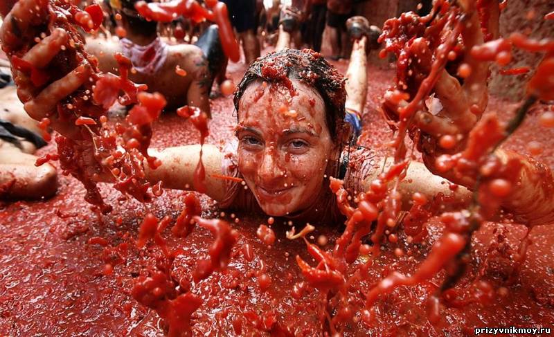 Традиционно в конце августа по улицам испанского города Буньоль текут багряные реки. Там проходит знаменитый фестиваль Ла Томатина, во время которого тысячи людей закидывают друг друга помидорами. Праздник, больше похожий на карнавал, проводится ежегодно уже на протяжении почти 70 лет.