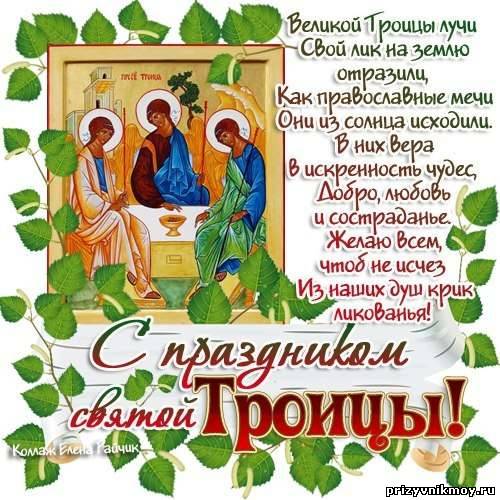 | В летний день, когда совсем тепло, Особый, чистый праздник отмечаем, И чтобы всем сегодня повезло, Мы Троицу с улыбкою встречаем.