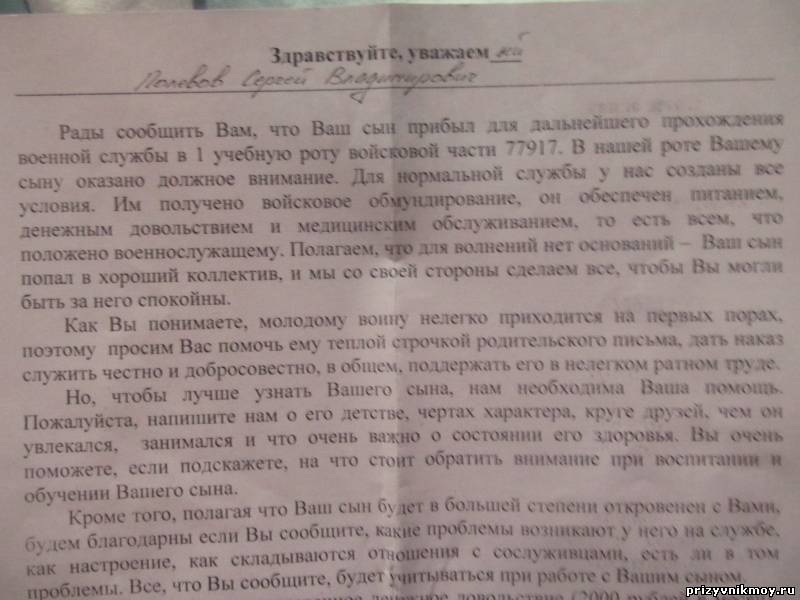 | Лина, у тебя писатель прямо! Наш одно написал и усё! И то шло полтора месяца! Пока мы на присяге были оно наконец-то дошло! И от сына и от ротного, он уже мне пообещал еще одно направить))