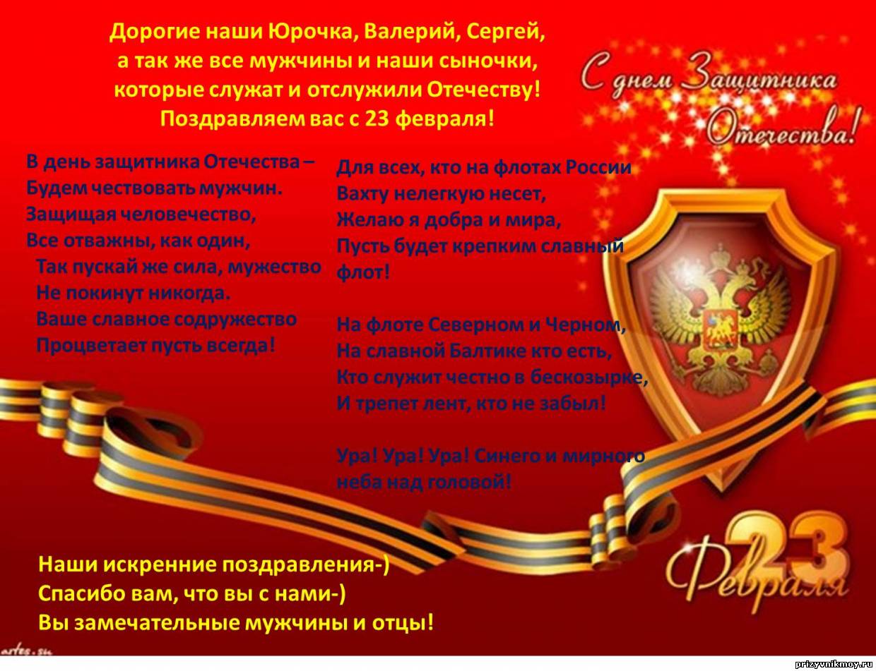 | Сегодня праздник у наших замечательных мужчин. Мы искренне поздравляем их с Днем защитника Отечества. Желаем им всего самого лучшего, что только есть на свете. Пусть даже солнце для них всегда и в особенности сегодня светит ярче. Пусть улыбки, как цветы, распускаются на их лицах. Хочется, чтобы их окружали только добрые и верные друзья и любящие люди. Желаем, чтобы их жизнь была яркой и интересной. Счастья вам, дорогие наши мужчины!