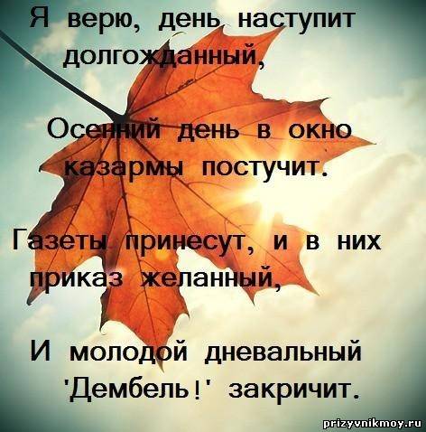 Цитата (Ленуся) оследнее время тоже нервишки шалят. Завтра аптека выпишет нам всем увеселительные таблеточки, и все будет хорошо! Цитата (мама-3) у многих смотрю...думала одна я (( Цитата (svetgluhova) сейчас уже меньше осталось, чем позади, а душа трепещет ничуть не меньше и "мокрые места" не забывают свои русла. Вот как у нас всё синхронно!!!!Я тоже думала-у меня одной нервишки.. Цитата (НатаНика) Я то же ращу одна, но всё относительно - живы здоровы и это главное Мальчишки там разбираются по обстановке Это точно-прйдёт немного времени ,обстановка расставит приоритеты,а парни наши(нами !!! рощенные ) разберутся!!!! Цитата (svetgluhova) Мне тоже пел однажды по телефону  растрогалась ... песню свою новую ... Как оказалось. стихи написал уже в части, а музыка в домашних заготовках была. Спрашиваю, а как на музыку-то положил, ее у тебя ведь нет с собой. Рассмешила его, говорит: я все помню, что сочинил... Светочка,и другие мамулички наших музыкантов,как здорово,что у мальчишек такие таланты,такие души,без чистоты души не рождаются стихи,не пишется настоящая музыка-так хотелось бы послушать!!!!!!!Пока только строевые слушаю в телефоне-каждый раз душа дрожит,что то в генах у нас, наверное... Я "Прощание славянки" и до армии без слёз слушать не могла,а уж теперь А в Одноклассниках сегодня кто то из девочек вот это стихотворение отметил,не могу вам не показать: