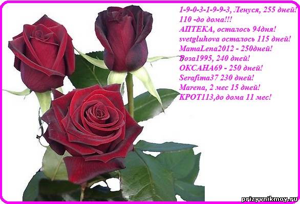 Добавлено (04.08.2013, 15:04) --------------------------------------------- Ой даток сколько красивых!!! Поздравляю, девочки - мальчики 1-9-0-3-1-9-9-3, Ленуся, 255 дней! 110 -до дома!!! svetgluhova осталось 115 дней! роза1995, 240 дней! Serafima37 230 дней! Marena, 2 мес 15 дней! Natali-STAVR 50 дней! KPOT113,до дома 11 мес! 1-9-0-3-1-9-9-3, поздравляю сынулю!!!