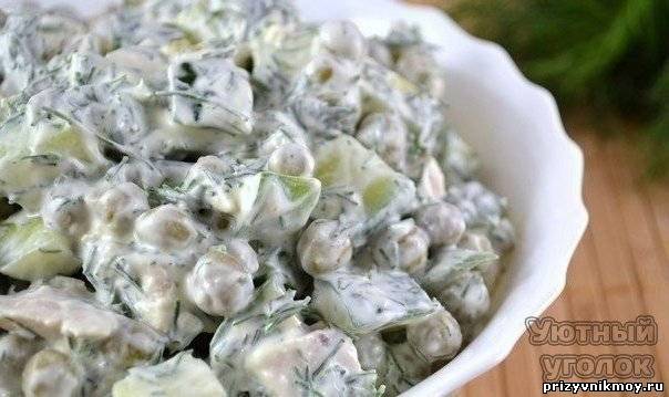 - 300 г куриного филе - 150 г огурцов - 150 г консервированного горошка (1⁄2 банки) - 150 г сметаны - пучок укропа - соль